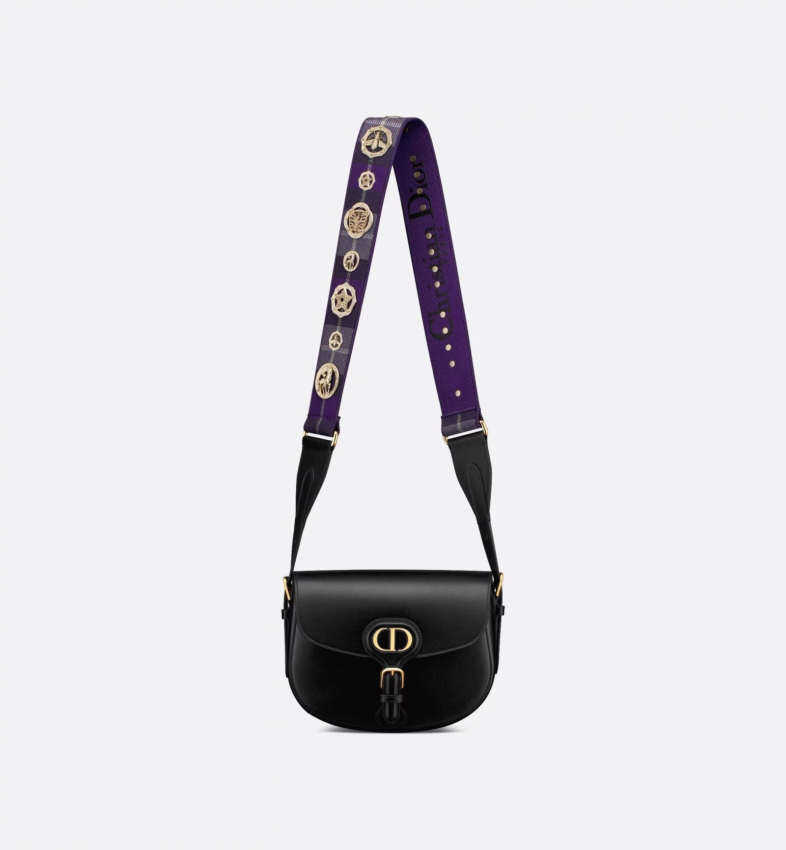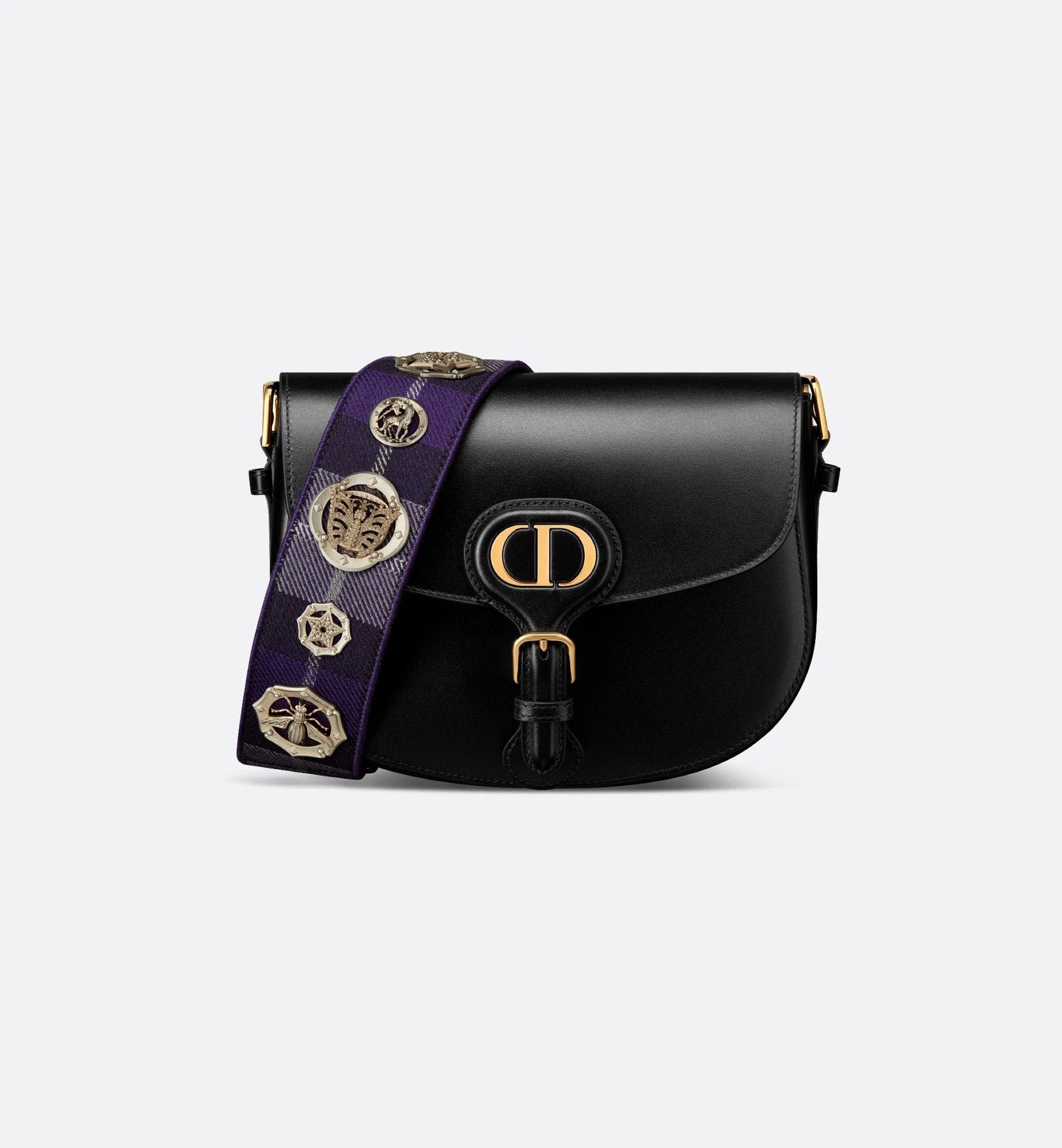 Elevating the hobo silhouette with modern sophistication, this Bobby Medium is rendered in supple black smooth calfskin, its sleek surface complemented by antique gold-finish hardware. The statement feature is an embroidered wide strap, adorned with medallions inspired by Scotland—a poetic nod to heritage and craftsmanship.