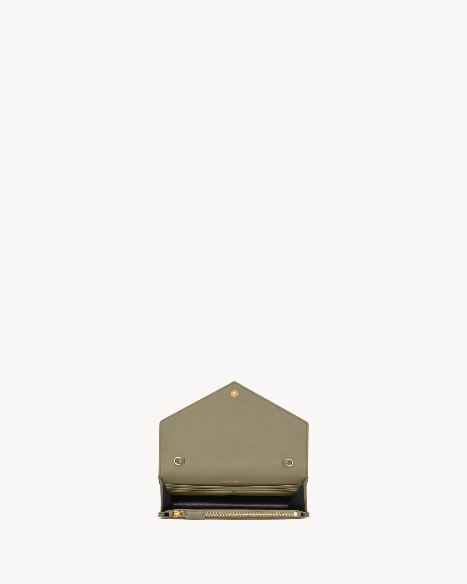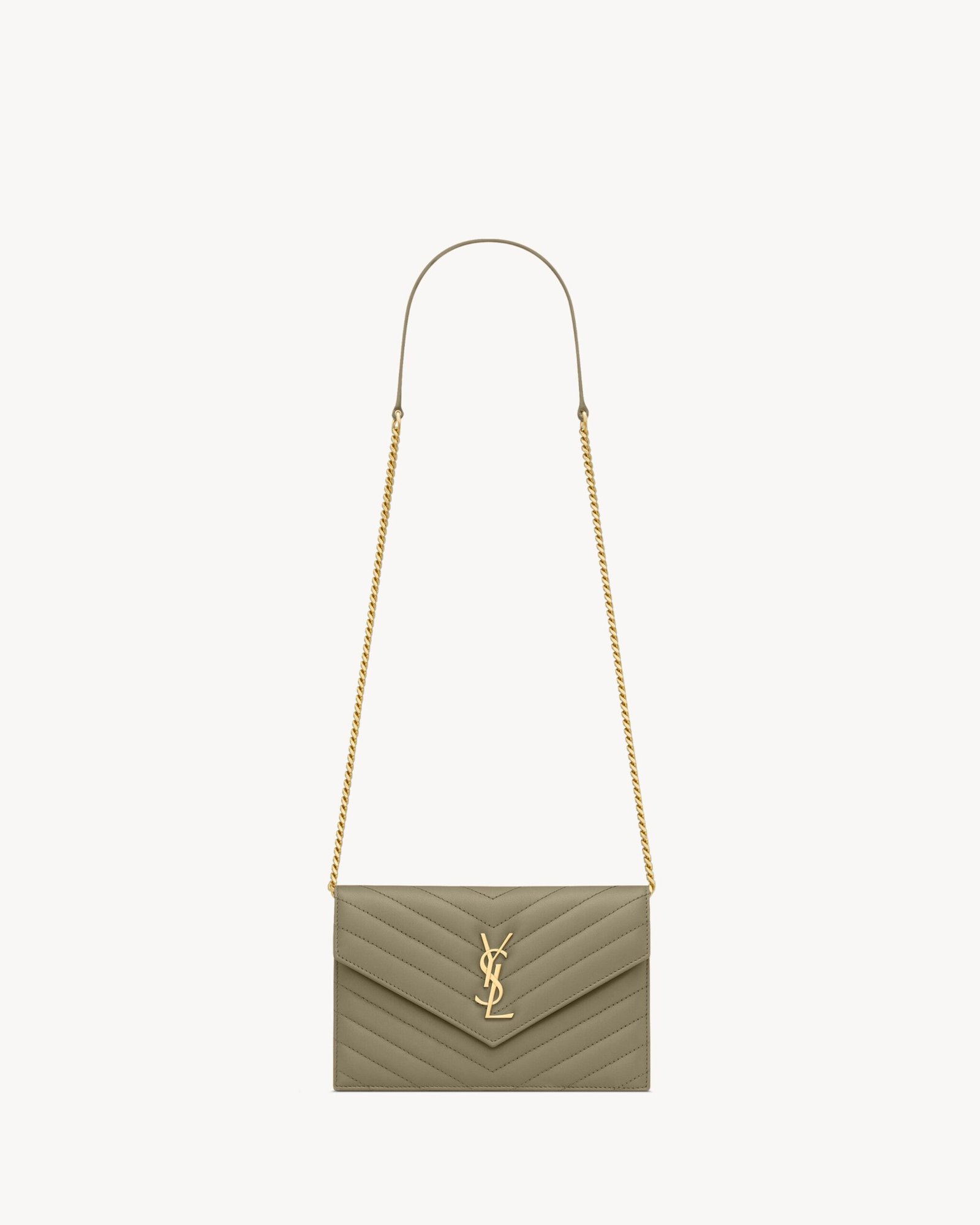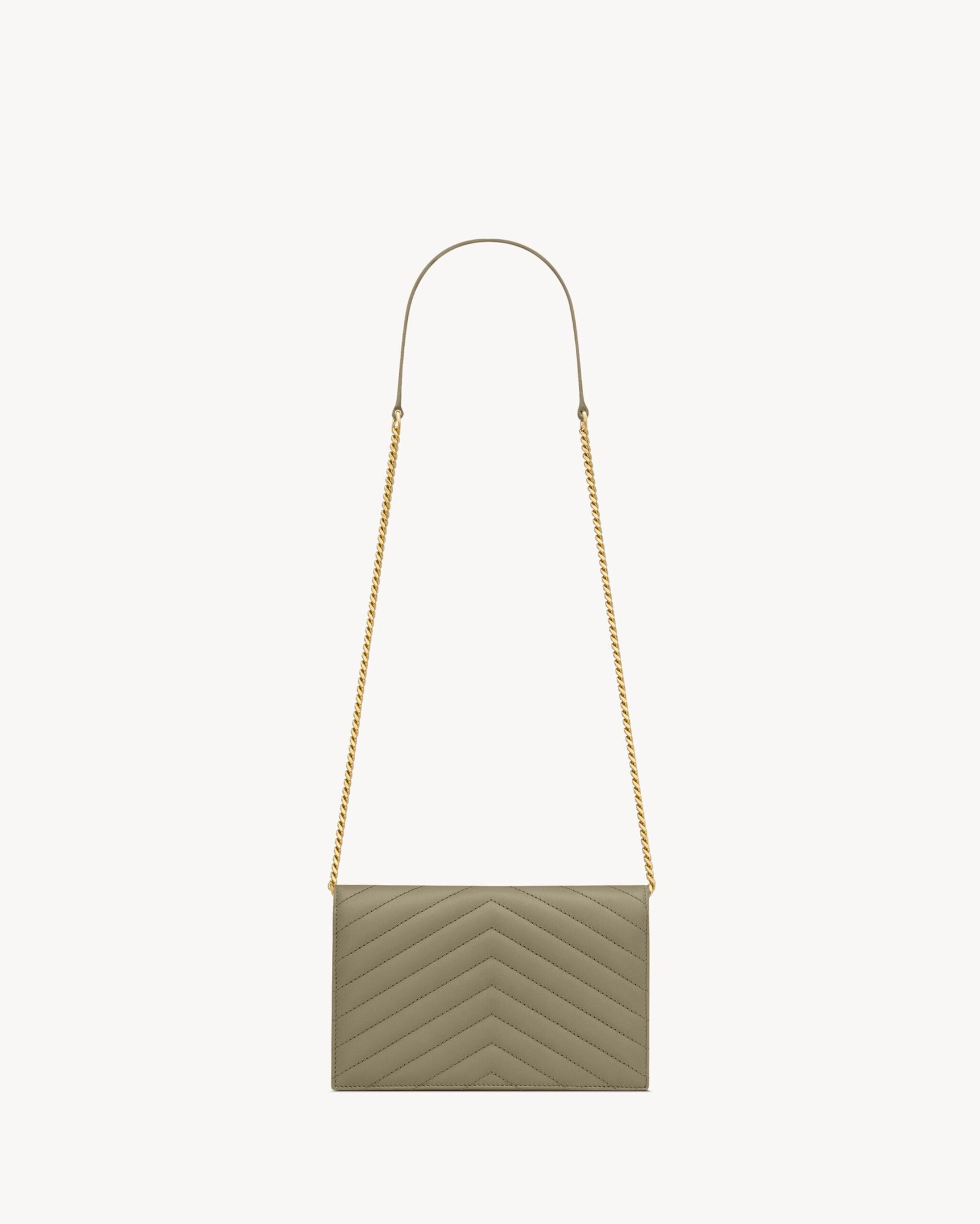 Sleek, structured, and effortlessly luxurious — the Cassandre Envelope Chain Wallet in Strong Moss is a timeless accessory reimagined in a bold, modern hue. Crafted from smooth lambskin with signature chevron-quilted topstitching, this compact piece is finished with the iconic Cassandre logo in gleaming gold-tone hardware.