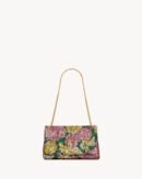 - Rich brocade fabric in green, pink, and gold hues