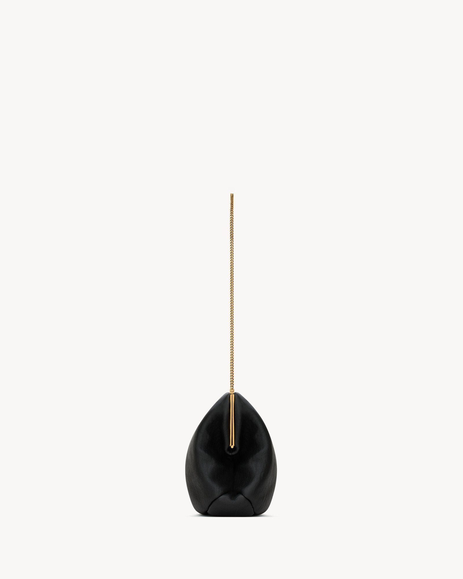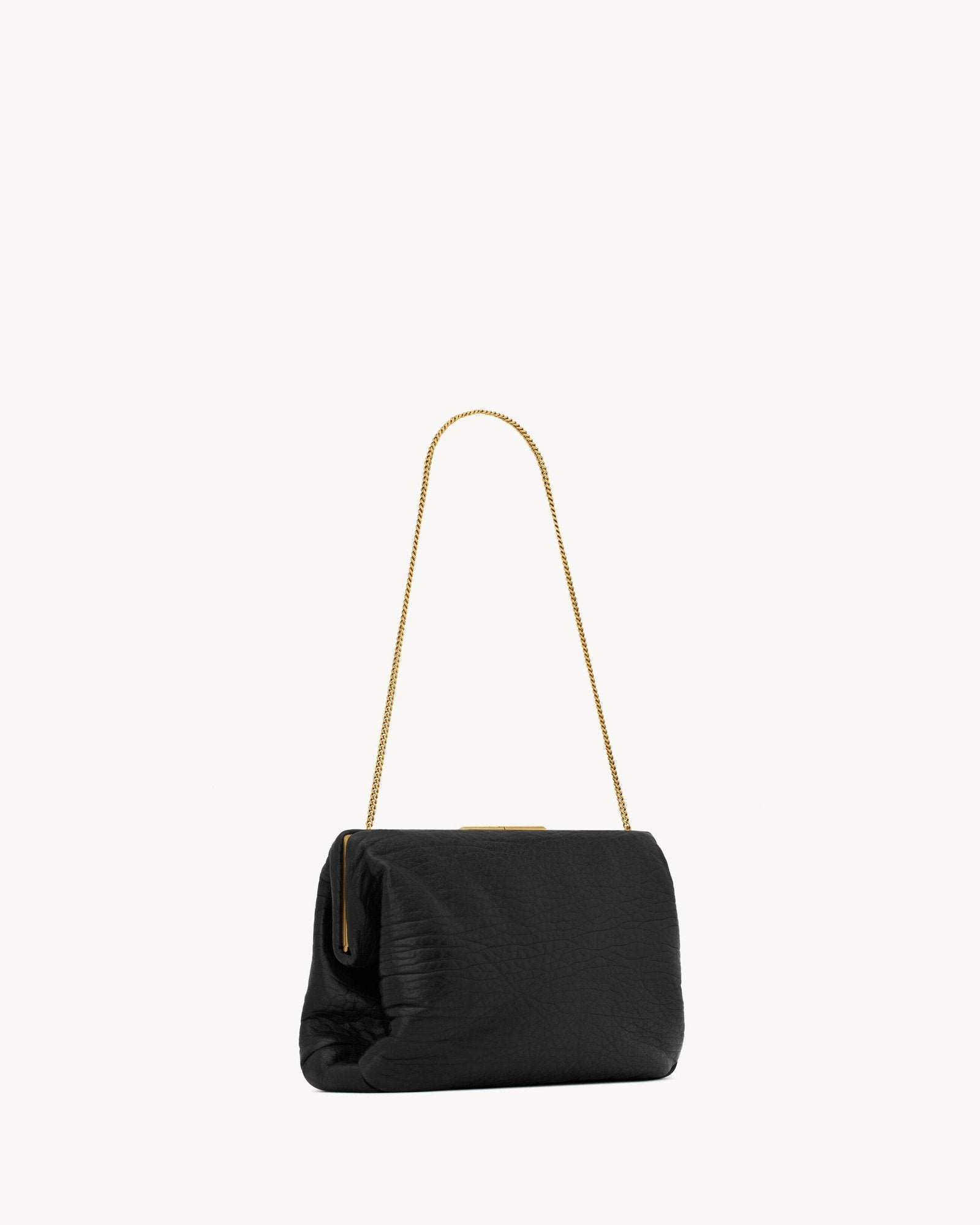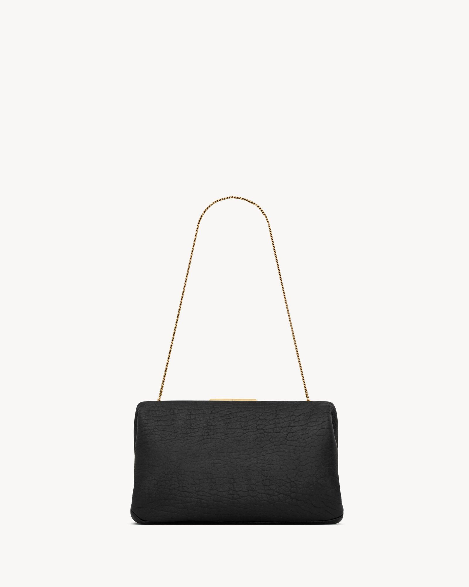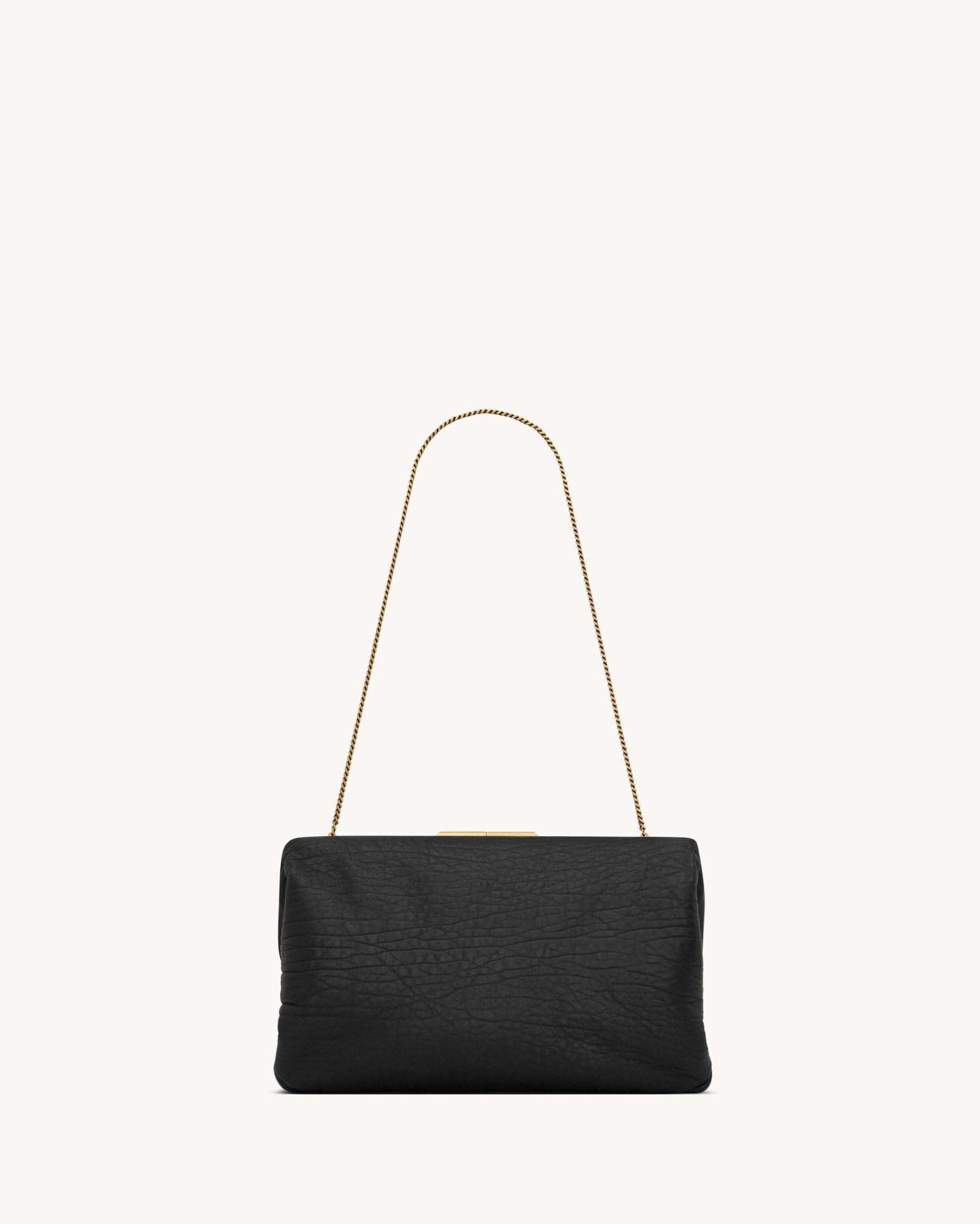 Effortlessly elegant, this spacious pouch clutch redefines versatility in soft grained lambskin. Its supple texture is complemented by a tonal satin lining and a refined engraved clasp, creating a sophisticated silhouette that transitions seamlessly from hand-held to shoulder carry with the stowable fine chain strap.