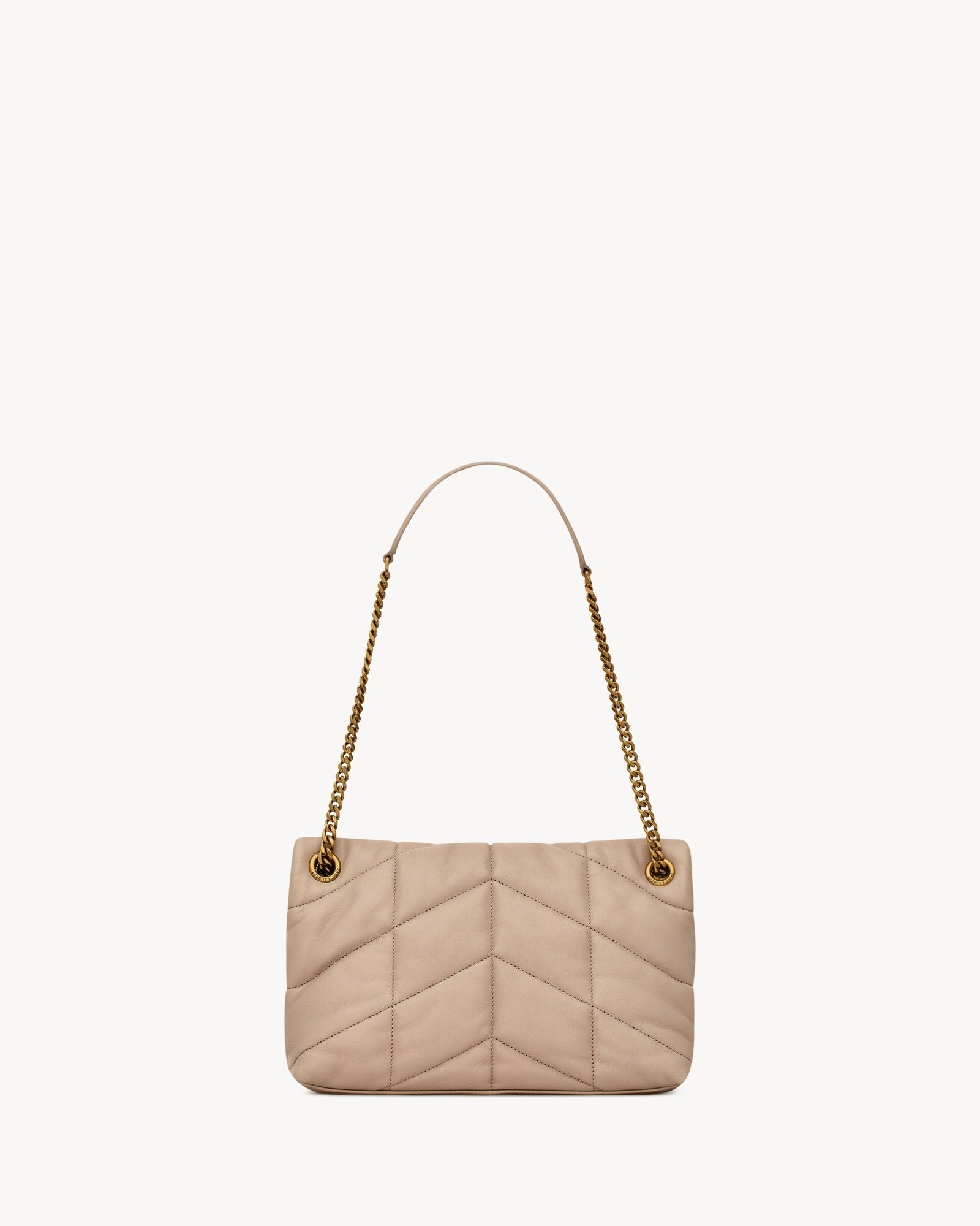 A sculptural take on everyday elegance, this small puffer bag is crafted from butter-soft lambskin in a muted, modern hue. Its signature chevron quilting evokes quiet luxury, while light bronze hardware adds a refined gleam. A fluid sliding chain transforms its silhouette—casual across the body, poised on the shoulder. Designed for the woman whose style speaks in subtleties.