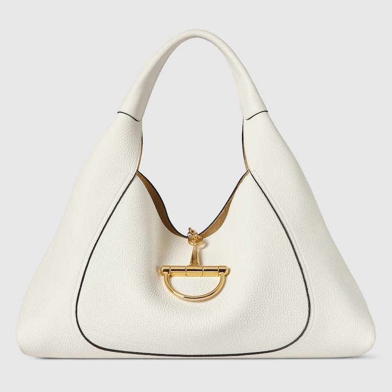 The Gucci Softbit Maxi Shoulder Bag redefines iconic style with the House’s signature hardware transformed into an oversized half Horsebit, serving as a magnetic closure for the relaxed silhouette. Crafted from supple, grainy white leather, this bag blends rich texture with modern elegance.