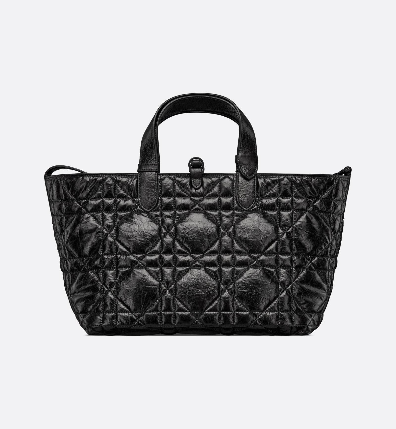 Sculptural top handles and a refined leather strap closure lend fluidity to the silhouette, while a signature clasp detail subtly transforms the bag’s form with a twist. Understated, practical, and exquisitely made, it transitions effortlessly from understated daywear to polished evenings.
